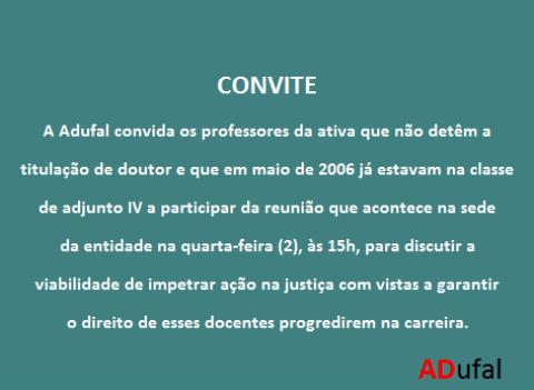 Adufal convoca para reunião na sede da entidade docentes da ativa que são Adjunto IV desde maio de 2006