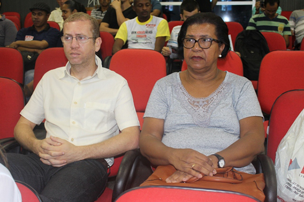 Diretores da Adufal -Com significativa participação de estudantes e servidores, o seminário contou também com a presença de diretores de entidades representativas das diversas categorias de servidores públicos. Da diretoria da Adufal estiveram presentes o secretário geral, professor Henrique Cahet,; a 1ª secretária, professora Margarida Santos; o tesoureiro, professor Jorge Brito Silva; a diretora de Política Educacional e Científica, professora Abdízia Alves Barros e o diretor de Política Sindical, professor Antônio Passos.