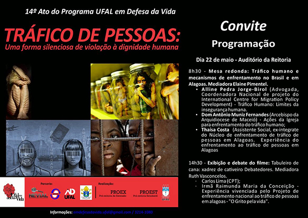 O Programa Ufal em Defesa da Vida realiza nesta quinta-feira (22), no auditório da reitoria, no Campus A. C. Simões, o seu 14º Ato, trazendo para reflexão da comunidade acadêmica e de toda a sociedade o tema “Tráfico de Pessoas: uma forma silenciosa de violação à dignidade humana”. A Adufal é um dos apoiadores desse Programa.