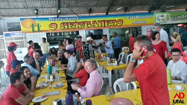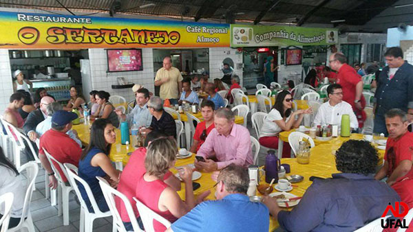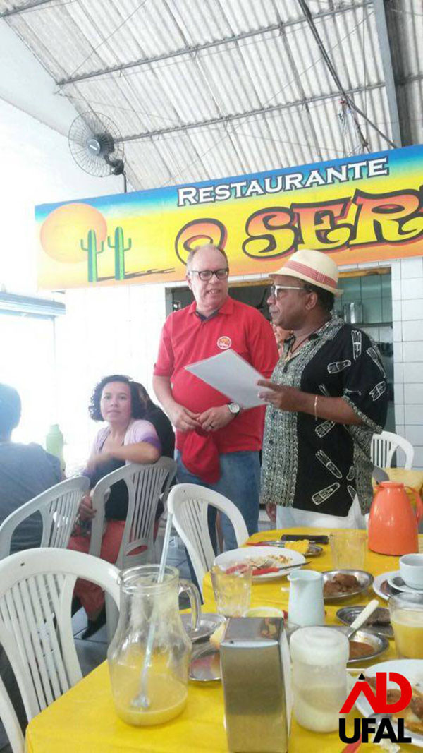A Associação dos Docentes da Universidade Federal de Alagoas (Adufal) participou, nesta quarta-feira (16), do café da manhã que reuniu intelectuais e artistas da cidade de Maceió. O encontro aconteceu no Mercado Público de Jaraguá e teve o intuito de discutir e dar voz a um manifesto que trata da luta contra o golpe a democracia brasileira. O documento foi lido pelo cantor alagoano, Igbonan Rocha, e em seguida os presentes assinaram o manifesto. A Adufal se fez presente e foi representada pelo vice-presidente Ricardo Coelho e os diretores Jorge Eduardo de Oliveira e Carlos Eduardo Muller. Em algumas breves palavras, Jorge Eduardo de Oliveira, classificou a participação da Adufal no café como de extrema importância, ressaltando que foi mais uma ação conjunta com a sociedade em favor da democracia.