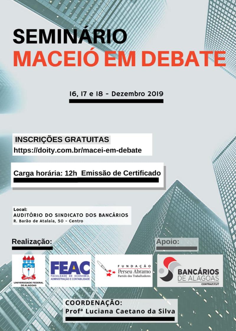 Com o propósito de debater os problemas enfrentados pela população de Maceió, a Universidade Federal da Alagoas (Ufal) e a Fundação Perseu Abramo, promovem conjuntamente o Seminário Maceió em Debate, nos dias 16, 17 e 18 de dezembro. O evento será realizado no auditório do Sindicato dos Bancários, localizado na Rua Barão de Atalaia, nº 50, no Centro, e as inscrições podem ser realizadas gratuitamente neste link: https://doity.com.br/macei-em-debate .