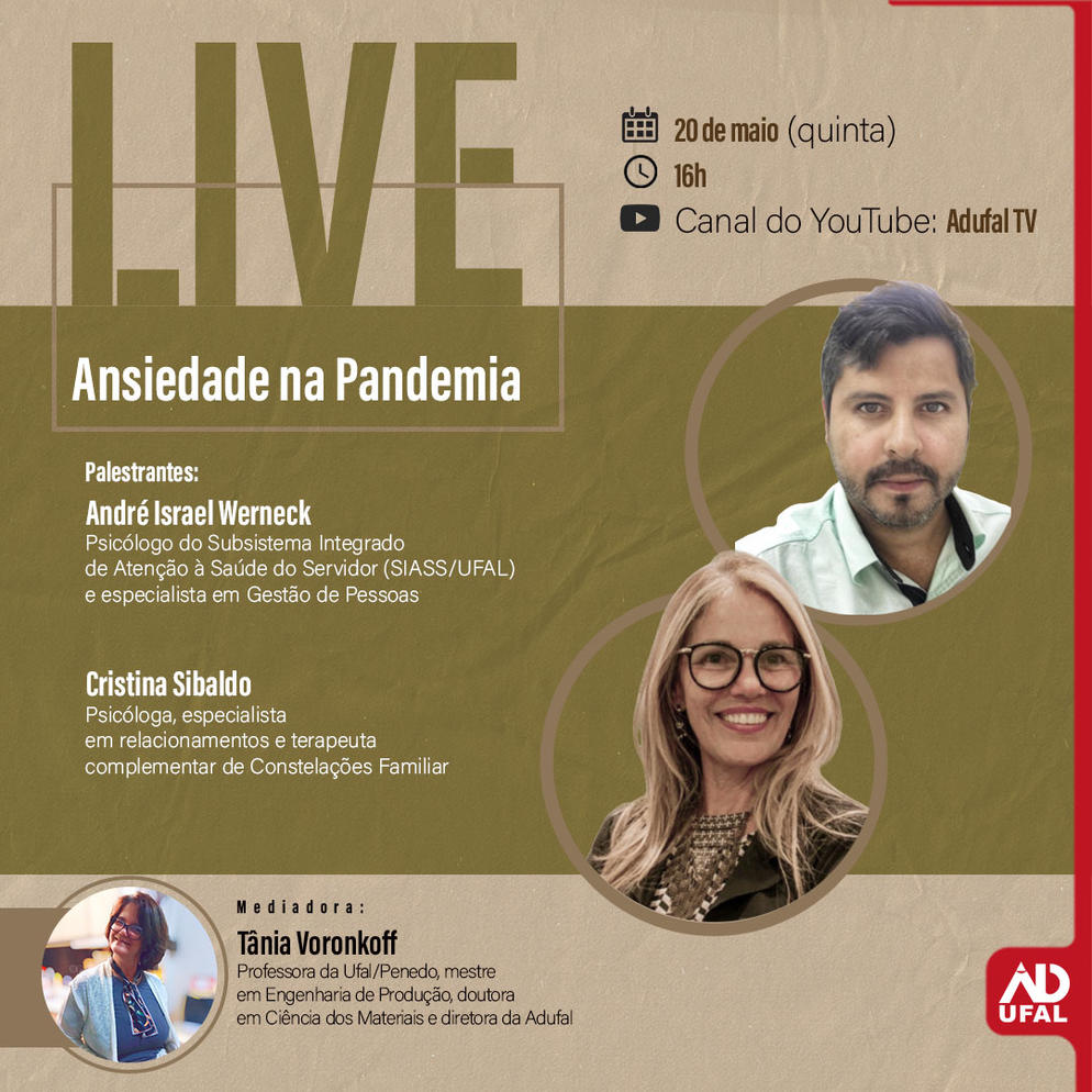 A primeira live desta série discutirá sobre “Ansiedade na Pandemia” e acontece já na próxima quinta-feira, 20 de maio. O encontro conta com a participação de dois palestrantes. Um deles é o psicólogo do Subsistema Integrado de Atenção à Saúde do Servidor da Ufal (SIASS), André Israel Werneck Miranda. Especialista em Gestão de Pessoas pela Universidade Católica Dom Bosco (UCDB), Miranda já atuou no Hospital das Clínicas da Universidade Federal de Pernambuco (HC-UFPE) e na Companhia Brasileira de Trens Urbanos (CBTU).