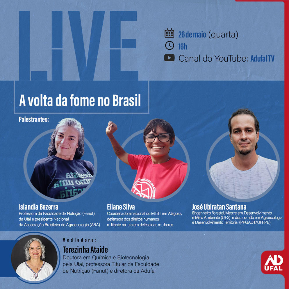 A segunda live da série debaterá o tema “A volta da fome no Brasil”, no dia 26 de maio. O encontro virtual terá três palestrantes. A primeira convidada é a professora da Faculdade de Nutrição (Fanut) da Ufal, Islandia Bezerra. A docente é também pesquisadora, extensionista, educadora colaboradora na Escola Latino-Americana de Agroecologia (ELAA) e presidenta Nacional da Associação Brasileira de Agroecologia (ABA).