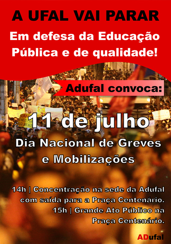 A Associação dos Docentes da Universidade Federal de Alagoas (Adufal) aderiu ao movimento do Dia Nacional de Lutas com Greves e Mobilizações - proposto pelas centrais sindicais brasileiras - e está convocando a categoria a fazer parte da manifestação que vai às ruas na quinta-feira (11).