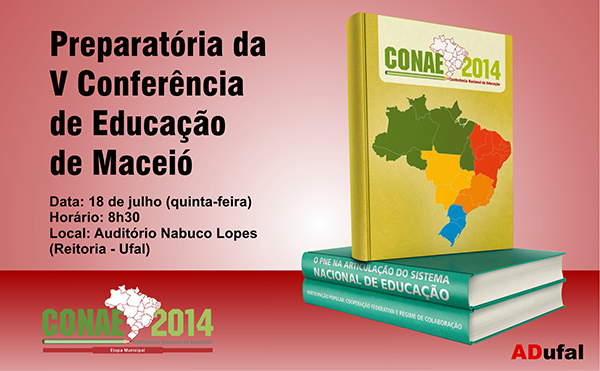 A Associação dos Docentes da Universidade Federal de Alagoas (Adufal), Sindicato dos Trabalhadores da Ufal (Sintufal) e a Ufal promovem na quinta-feira (18), a partir das 8h30, no auditório da Reitoria, no Campus A. C. Simões, a Conferência Preparatória da Ufal para a V Conferência Municipal de Educação de Maceió, uma das etapas da Conferência Nacional de Educação (Conae 2014) a ser realizada em fevereiro de 2014, em Brasília.