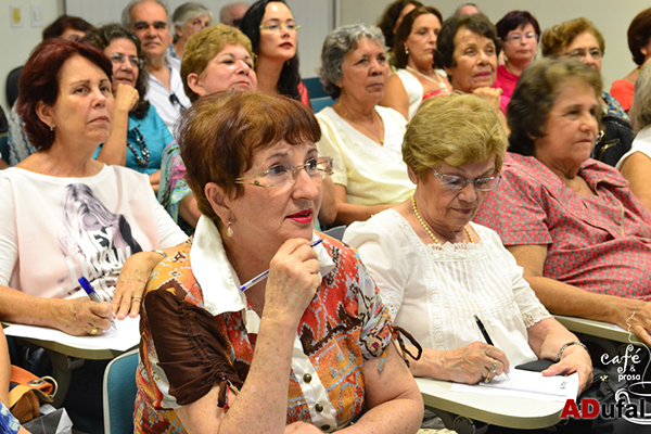 O tema da palestra proporcionou animados e reveladores depoimentos da plateia. A professora Elce Amorim Ferreira de Moraes, que dirigiu por 13 anos o antigo departamento de Educação e ajudou a transformá-lo em Centro (Cedu), confessou se sentir bela, plena e no auge de sua vida. “Não somente de alma, mas também fisicamente quando me olho no espelho”, disse séria e emocionada.