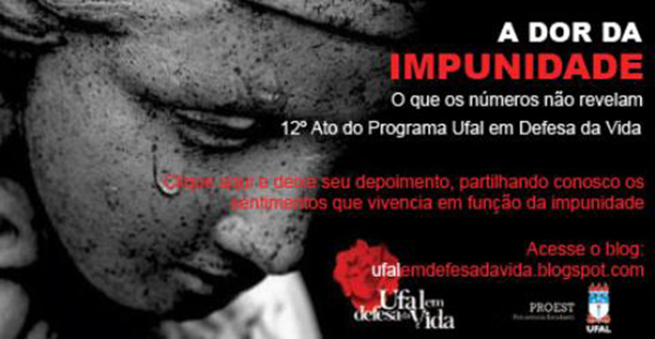 “A luta contra a impunidade é uma luta em defesa ao estado democrático de direito. Onde estão os amigos e familiares das pessoas que foram assassinadas em nosso Estado, e que representam 92% dos casos que ainda esperam por justiça em Alagoas? Precisamos reunir essas pessoas para que elas se fortaleçam nessa luta e possam desindividualizar suas ações. Tenho a expectativa de que o 12º Ato poderá viabilizar a reunião das vítimas da impunidade no Estado e, quem sabe, essa reunião possa se reverter na constituição de uma organização política das vítimas da violência contra a impunidade em Alagoas”, destacou Ruth Vasconcelos. “Se conseguirmos dar voz a essas pessoas que sofrem em função da impunidade, a Ufal já estará cumprindo um importante papel para a nossa sociedade”, concluiu.